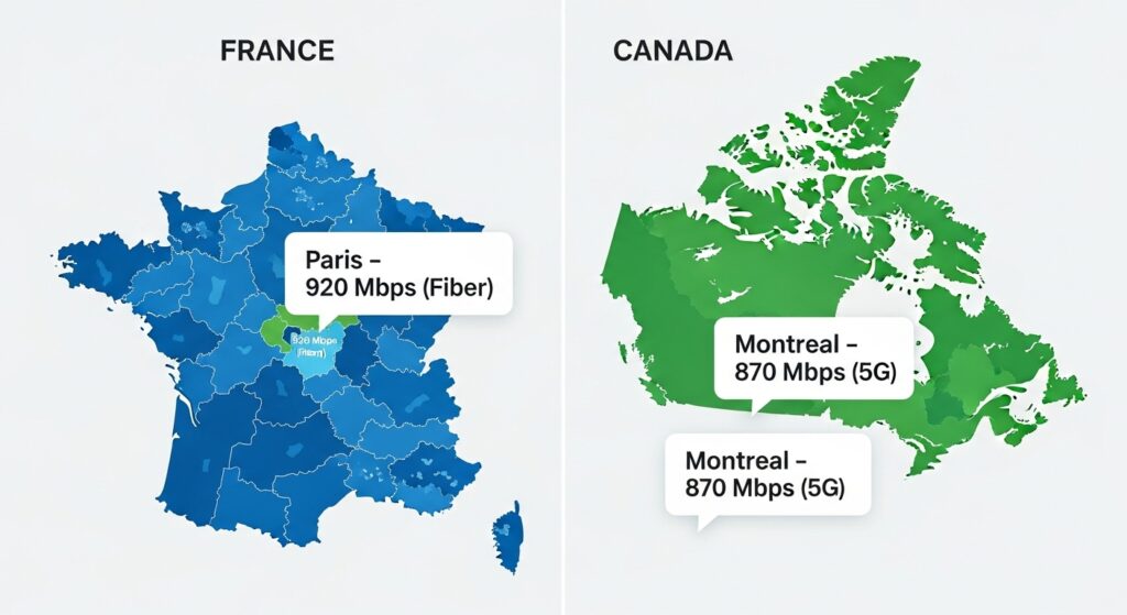Au Canada, notre test de vitesse Internet prend en charge les principaux fournisseurs tels que Bell, Rogers, Vidéotron, TELUS et Shaw. Grâce à des serveurs hébergés à Montréal, Toronto, Ottawa et Vancouver, nos tests mesurent votre performance réelle selon la région, la technologie utilisée et le type de plan Internet.